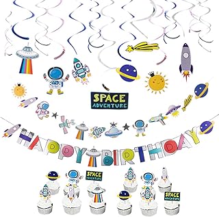 SUNBEAUTY Space Brthday Decoration Anniversaire Espace Garcon Kit Tourbillon Suspendu Deco Happy Birthday avec Cake Topper Fusée Planète Space
